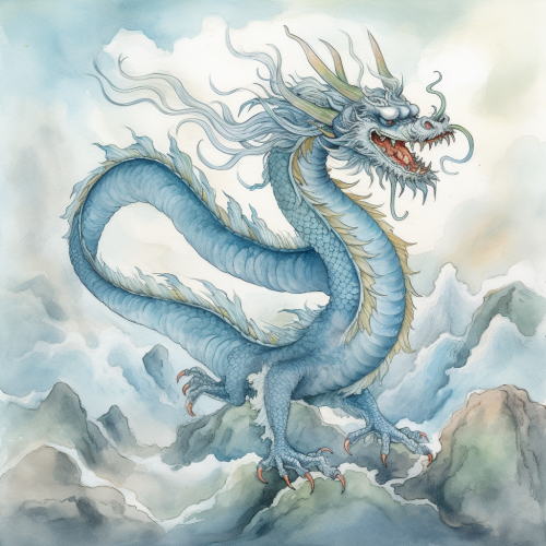A majestic Chinese dragon with human-like features, cartoon style, color tones of pale blue, white, and black, profile view, delicate scales and facial features blending dragon and human traits, subtle glow on the scales enhancing the mystical aura, set against a misty mountain backdrop with faint clouds, tranquil and mysterious ambiance suggesting ancient wisdom and power, Artwork, detailed watercolor painting on textured paper, --ar 1:1 --v 5.0