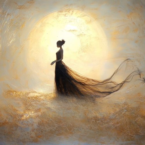 A majestic and elegant scene featuring the silhouette of a divine feminine figure, capturing grace and empowerment. The setting could be a celestial or ethereal background, such as a softly glowing sky with hints of dawn or twilight, a serene, otherworldly landscape, or a radiant, abstract space filled with gentle light. The central focus is on the silhouette of a woman in a poised, empowering stance, perhaps with flowing drapery or a subtle, graceful pose that suggests both strength and serenity. The background features soft, luminous colors like gentle golds, serene blues, and pure whites to enhance the divine and graceful atmosphere. Subtle details like a halo of light, delicate light patterns, or ethereal glow around the silhouette add to the sense of reverence and beauty. The overall mood is majestic and inspiring, capturing the essence of divine grace through the simplicity and elegance of silhouettes.