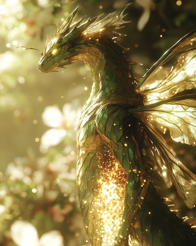 A Dragon Bee, shimmering with divine energy, its body full of glowing pollen. The creature has the majestic form of a dragon with delicate bee wings, its scales gleaming in the light of Aphrodite’s council. --v 6.1 --ar 4:5 --no border, sign --s 345 --c 45