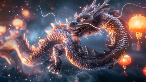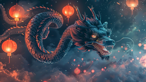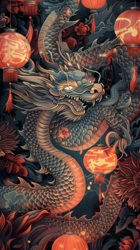 A highly detailed and visually immersive Chinese New Year wallpaper design featuring a majestic dragon with well-proportioned limbs and claws on both sides of its body. The dragon should have a powerful, muscular form, with intricate scales and a natural stance that conveys balance and movement. Surround the dragon with glowing red and gold lanterns, casting realistic shadows. The background should include rich, traditional Chinese patterns and floral motifs, all rendered in vibrant, deep colors, creating a strong sense of depth and dimensionality --ar 9:16 --v 6.0