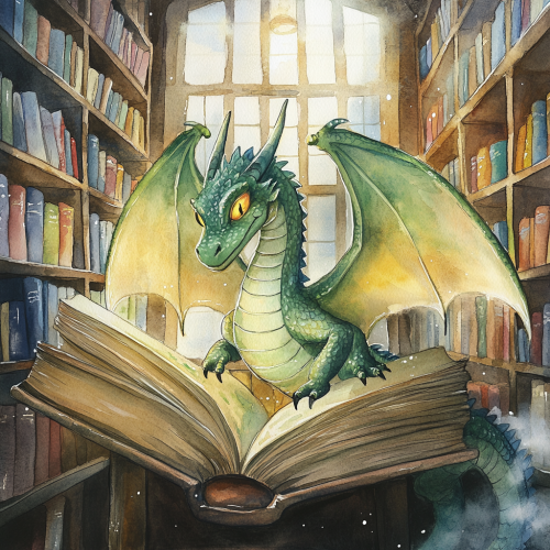 A watercolor illustration for a children's book. A majestic dragon with shimmering green scales, large wings, and glowing golden eyes that shine like the sun, emerging from an open book in a cozy library. The dragon is partially outside the book, as if stepping into the real world, surrounded by towering bookshelves filled with colorful storybooks. Soft light filters through the windows, creating a magical atmosphere. The style should be whimsical, colorful, and friendly to captivate children's imagination.