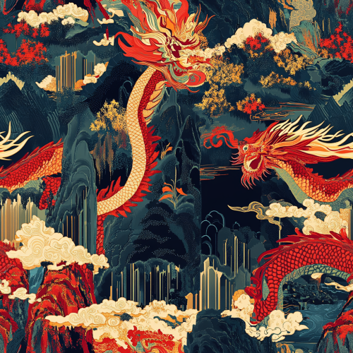 Huge landscapes, filled with wonder, dragon in style of traditional Chinese embroidery, mostly dark colors with prominent vibrant red --style raw --tile