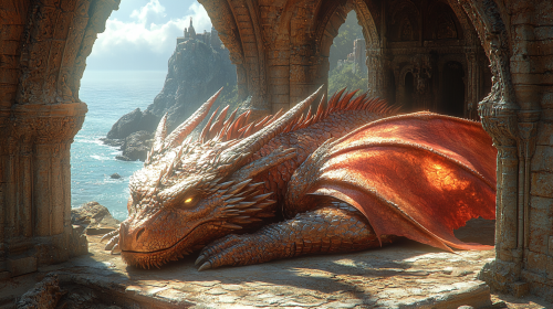 wide shot, focus on a frindly Bronze colored Dragon with wings, it is sleeping in the a gnomish temple, the sides of the temple are open arches, the background is the vast ocean, the dragon is majestic but calm, DnD atmosphere, 8k digital, super resolution, --s 750 --ar 16:9