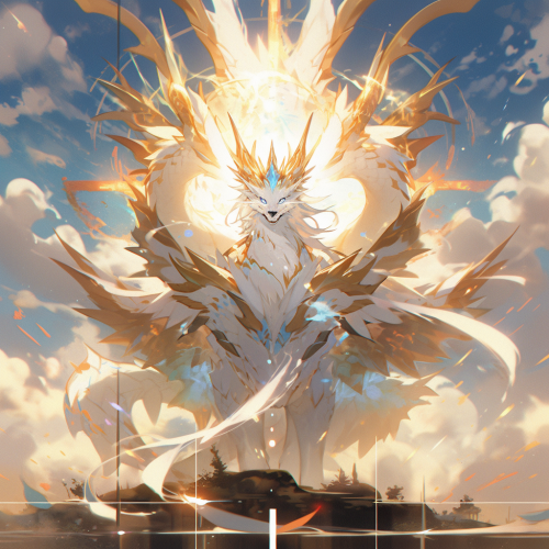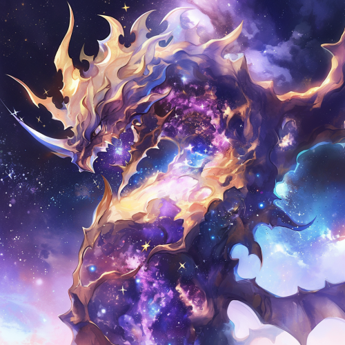 a majestic, dragon-like head crowned with golden horns and a luminous third eye, which glows with the power of omniscience. Its body is a blend of galactic elements--nebula-like clouds swirl around its torso, with stars and distant galaxies twinkling within. Its skin shimmers in hues of purple, blue, and gold, representing both day and night. Enormous wings made of radiant stardust and cosmic energy stretch out, constantly shedding shimmering particles that represent the passage of time. These wings fade in and out of reality as if the Pokémon exists beyond physical space. Tail: Its long tail splits into multiple ends, each representing a different dimension of time--past, present, and future--glowing in different colors. emanates an aura of divine light that shifts into an eerie shadow as it moves, highlighting its dual role in maintaining balance between creation and destruction, pokemon style, screencap --niji 6