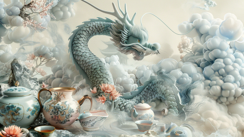 Chinese illustration on white background, 3d, tea, pastel, dragon, fire, landscape, auspicious clouds, exquisite details, horizontal version, 8k, graphic illustration style --ar 16:9 --v 6.0 --s 50