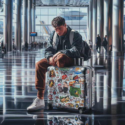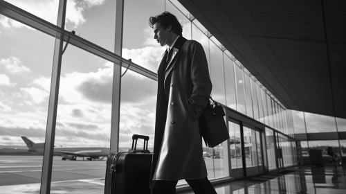 Gunther Sachs wearing balenciaga at an airport in sylt artistic campaign shot, lots of light and a little bit of grain --style raw --ar 16:9 --v 6.0