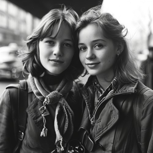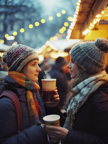 Berlin, Germany, 2002, Friends bundled up with colorful scarves, sipping hot mulled wine together at a snowy Christmas market, festive lights twinkling in the night, Kodak UltraMax 400 --ar 3:4 --v 6.1