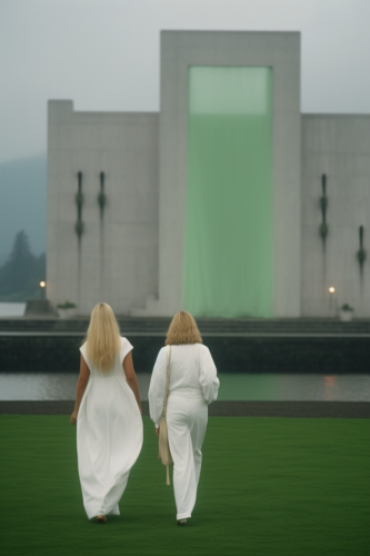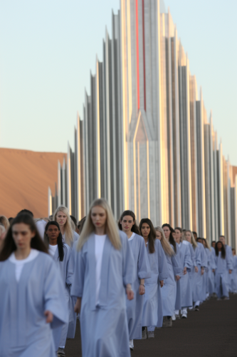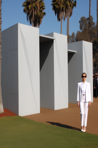 fashion show in front of monumental airport in kuwaitsilver materiality, designed by rifat ozbek, valerio olgiati, ricardo bofill, kazuyo sejima, simple aesthetics, scanner photography, 20 megapixels, minimalist setting --ar 2:3 --style raw --chaos 70 --weird 70 --stylize 150