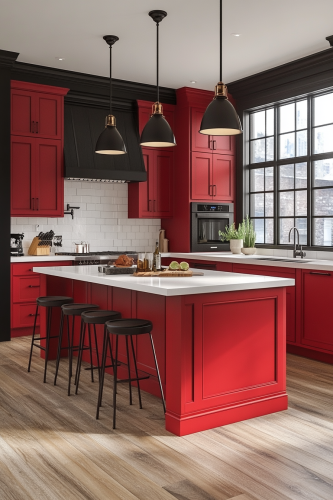 Show a kitchen with Cherry Chic red kitchen cabinets, sporting a vibrant cherry red that brings a playful yet stylish vibe to the space. These cabinets should be paired with a stark white quartz countertop and a Scandinavian-style light wood floor to maintain a fresh, modern look. Incorporate minimalist black hardware and a series of modern bar stools at the island for a contemporary feel. Include large windows to flood the space with natural light, making the red pop even more. This kitchen should look sleek, modern, and incredibly inviting. Camera: DSLR - Canon EOS 5D Mark IV. Lens: Canon EF 24-70mm f/2.8L II USM. Composition: Wide shot, room-centered, horizontal orientation, balance between furniture and space. Film: Digital, high resolution, color profile sRGB. Camera settings: ISO 400, f/2.8, 1/60 sec. --ar 2:3 --v 6.1 --s 250