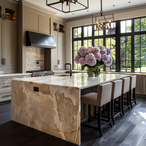 luxury modern organic kitchen. A whole room. Black lined windows. white brown marble waterfall island. Cream upper cabinets. Brown taupe lower cabinets. Minimalist abstract cream vintage art above stove range. Wall sconces. 3 modern Accent bar chairs. tall large vase of purple hydrangea flowers on island. Dark brown oak floors. Modern square pendants. Layer the room with accent pieces. Fall aesthetics. Realistic style --ar 1:1 --v 6.0 --s 250 --style raw