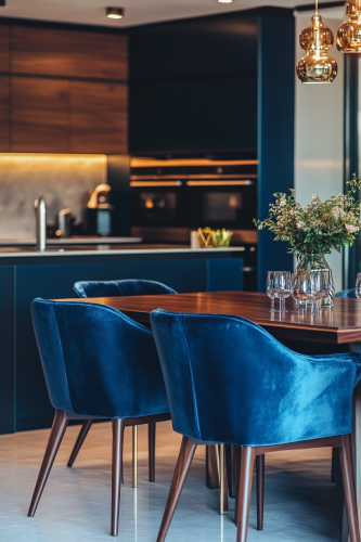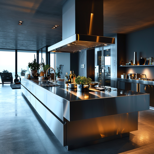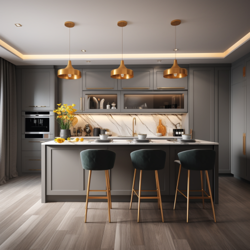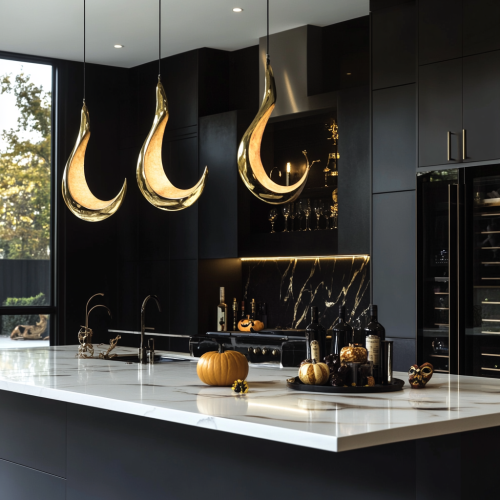 Design a sleek, ultra-modern kitchen with a subtle Halloween theme, seamlessly blending luxury and spooky elegance. The kitchen features clean lines and minimalistic design, with matte black cabinetry contrasted by a stunning white marble countertop with black and gold veining, running along the central island and countertops. The centerpiece of the room is a large kitchen island, where golden pendant lights shaped like crescent moons hang from above, casting a soft, warm glow. The backsplash behind the stove is made from black, glossy tiles, reflecting light in a way that adds depth and mystery to the space. Subtle Halloween details are integrated into the design without overpowering the modern aesthetic. Elegant black pumpkins with gold stems are placed on the countertops, while glass jars filled with candy corn and dark chocolates sit near the marble countertop, adding a festive yet classy touch. On one of the open shelves, black and gold potion bottles are displayed, giving a mysterious alchemy vibe to the space. The kitchen appliances are top of the line, with a black stainless steel fridge and a built-in wine cooler with custom lighting, showcasing bottles with spooky custom labels. The room features large floor-to-ceiling windows that allow natural light to flow in during the day, but at night, the amber under-cabinet lighting creates a warm, moody atmosphere. A corner of the kitchen holds an elegant bar cart decorated with crystal glasses and modern, Halloween-themed cocktail accessories, such as stirrers shaped like witch hats and skulls. Small, sleek black candles with flickering flames are positioned around the kitchen, adding a soft, eerie glow that balances the sophistication of the space with the spooky season. The overall design is luxurious and [...]