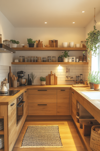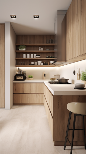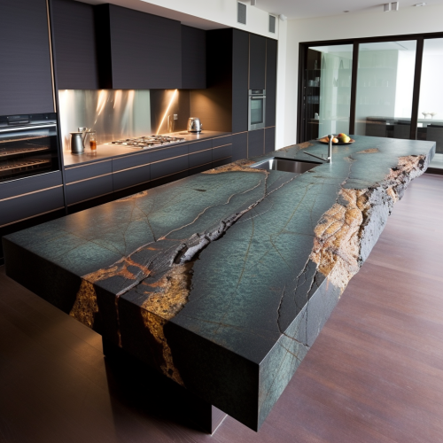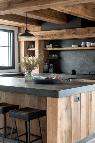 Create an image of a modern rustic fusion kitchen where contemporary black metal accents meet rough, unfinished wooden beams and shelving. The contrast between dark stone countertops and light oak cabinetry should be striking, emphasizing the fusion of styles. Include innovative elements like a hidden pop-up vent or integrated smart home technology. The layout should be functional yet aesthetically pleasing, with a central island featuring unique stool seating. This image should encapsulate the harmony of modern and rustic elements, enticing viewers to explore the possibilities of a modern rustic fusion kitchen. Camera: DSLR - Canon EOS 5D Mark IV. Lens: Canon EF 24-70mm f/2.8L II USM. Composition: Wide shot, room-centered, horizontal orientation, balance between furniture and space. Film: Digital, high resolution, color profile sRGB. Camera settings: ISO 400, f/2.8, 1/60 sec. --ar 2:3 --v 6.1 --s 250