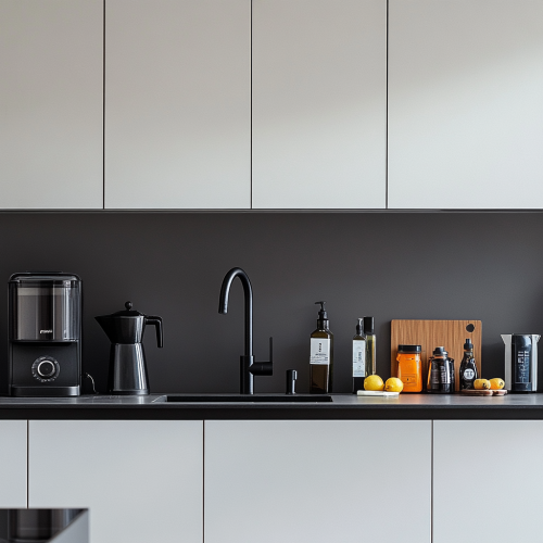 Highly detailed photograph of a modern kitchen with a sleek design. The kitchen features white cabinets with clean lines and a minimalist aesthetic. The countertops are black with various kitchen appliances like a microwave, toaster, and blender neatly arranged. The sink area has a black faucet, and there are various kitchen items like cleaning supplies and spices on the counters. The floor is tiled, and the overall atmosphere is bright, modern, and functional, with a strong emphasis on cleanliness and organization.