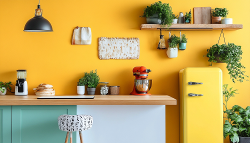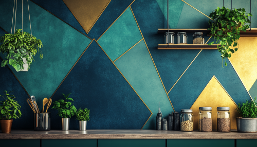 Create an image showcasing three of the seven inspiring kitchen wall decor trends mentioned in the article. Use bright, bold colors and geometric shapes to create a modern, eye-catching design. Incorporate elements such as hanging plants, metal accents, and unique wall art to add depth and texture to the image. The kitchen should be depicted as well-lit with clean, white surfaces to allow the decor to be the focal point. --ar 128:73