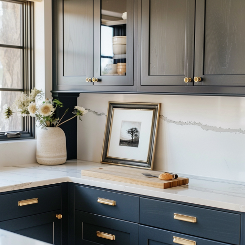 an inteiror designed kitchen by mcgee and co of a close up image of a picture frame sitting on a kitchen counter.