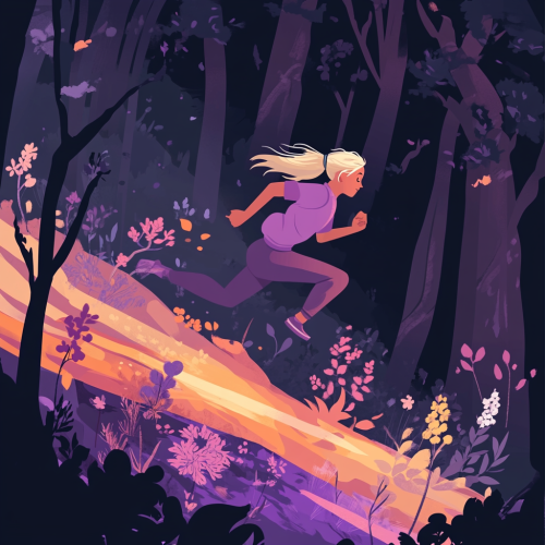 A minimalistic vector design, cartoon drawing, a non-binary individual (with female features and a shaved side head with a blonde messy bun) running through the wilderness. Very dramatic. The person is in lilac purples running through this dark forest, and as they run they are leaving a colorful trail behind them of flowers and life. Created Using: flat vector illustration, soft gradients, clean lines, minimalism, abstract clouds, digital nomad, modern technology, professional graphic design