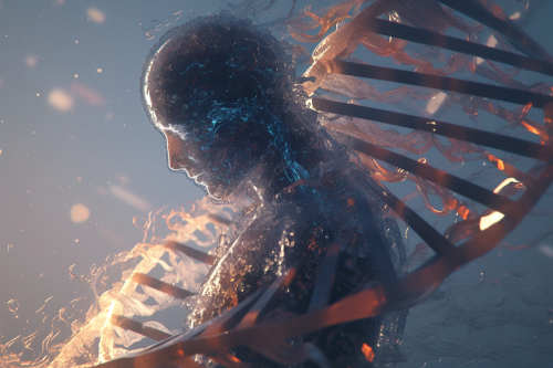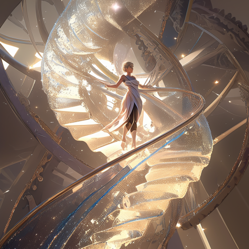 I’d love your help bringing a concept to life that explores the fusion of biology and technology. The idea is to visualize the human genome (AGCT base pairs) as it transforms into binary code (0s and 1s), capturing the transition from organic life to digital form in an elegant and abstract way. Imagine a human figure standing in a vast, futuristic space, with strands of DNA gracefully intertwining around their body, slowly morphing into shimmering binary code. This process represents the essence or soul of the figure being etched onto a radiant, futuristic tablet--like an ancient cuneiform tablet, but modern and ethereal, symbolizing the merging of life and technology. The image should feel transcendent, with a color palette of light blues, silver, and iridescent tones, evoking both the fragility of life and the beauty of the digital world. The overall aesthetic should be elegant, thought-provoking, and futuristic--capturing a vision of humanity imprinted onto the fabric of the future. --niji 6