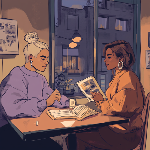 A minimalistic vector design, cartoon drawing, a non-binary individual (with female features and a shaved side head with a blonde messy bun, and many silver earrings) painting in a very cozy, dark warm tone interior Airbnb setting, painting. The person is in lilac purples and is sitting at the table with her beautiful brown wife who can be seen beside her, reading. The wife has a short brown french bob haircut. Created Using: flat vector illustration, soft gradients, clean lines, minimalism, abstract clouds, digital nomad, modern technology, professional graphic design