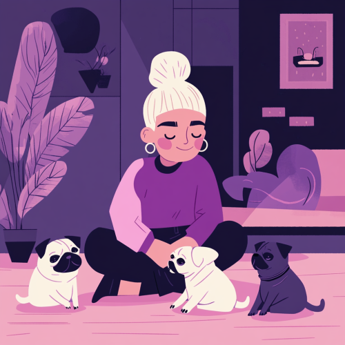A minimalistic vector design, cartoon drawing, a non-binary individual (with female features and a shaved side head with a blonde messy bun, and many silver earrings) playing with 2 pugs. Very cozy, dark warm tone interior Airbnb setting. The person is in lilac purples and is sitting on the floor in front of her wife who can be seen behind her, sitting on the couch. Created Using: flat vector illustration, soft gradients, clean lines, minimalism, abstract clouds, digital nomad, modern technology, professional graphic design