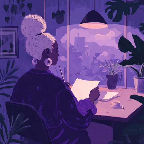 A minimalistic vector design, cartoon drawing, a non-binary individual (with female features and a shaved side head with a blonde messy bun, and many silver earrings) painting in a very cozy, dark warm tone interior Airbnb setting, painting. The person is in lilac purples and is sitting at the table with her wife who can be seen beside her, reading. Created Using: flat vector illustration, soft gradients, clean lines, minimalism, abstract clouds, digital nomad, modern technology, professional graphic design