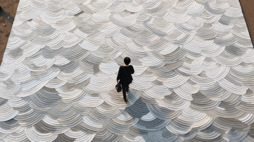 bird eye view of concrete paver made of sequin fabric, white and grey, fish scale, Islamic pattern, simple, with a people, 8k --ar 16:9 --s 200