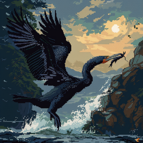 256 x 256 8 bit pixel art, cormorant catching a fish --v 6.0