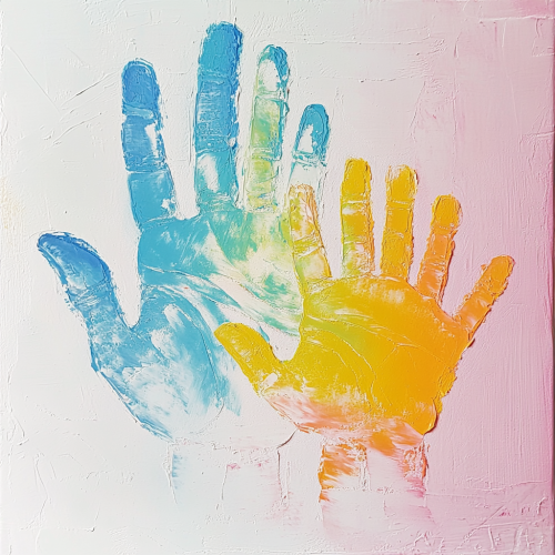 A heartwarming handprint artwork showing a large adult handprint on the left and a smaller child’s handprint on the right. The hands are touching at the fingertips, symbolizing connection and care. The adult handprint is in soft, calming colors like pastel blue, while the child’s handprint is in vibrant, playful colors like bright yellow. The background is a gentle gradient from light pink to white, enhancing the emotional warmth of the scene.