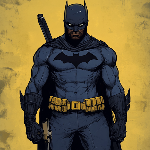 a black man in a navy blue super suit, vigilante, street level hero, face is partially covered, allowing his mouth to show, wielding a pair of tonfa batons, pistols on his belt, taser at his side, badass, epic, full body, in the style of comic books, drawn, 2D style
