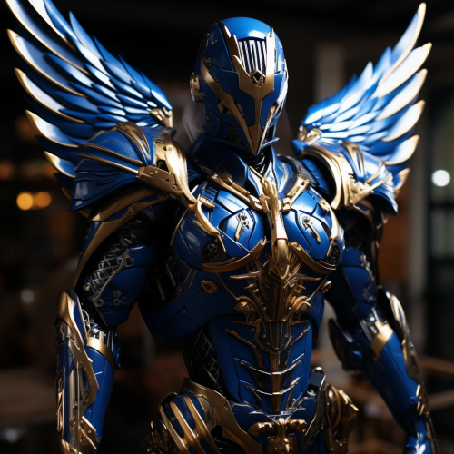 blue bird inspired soldier suit , superhero, wielding a bow and arrow, with high tech blue mechanical wings very realistic. --s 250