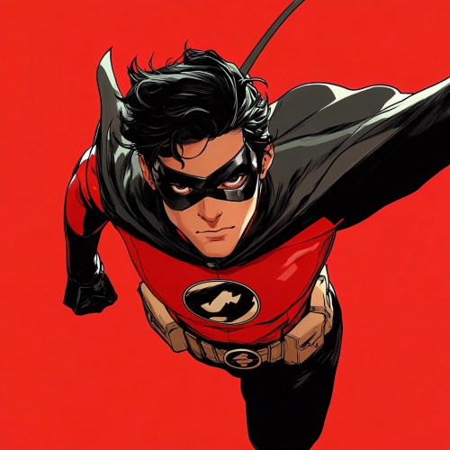 an eighteen year old male superhero wearing a red and black suit, mask, black hair, chiseled jaw, handsome, charismatic, flying, epic, in the style of comic books, 2d, drawn, cape