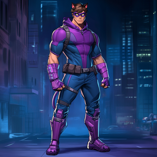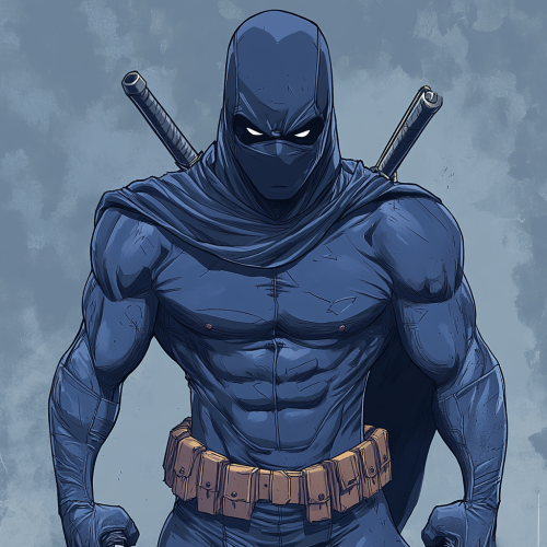 a black man in a navy blue super suit, superhero, street level hero, face is partially covered, allowing his mouth to show, wielding a pair of tonfa batons, pistol on his belt, taser at his side, badass, epic, full body, in the style of comic books, drawn, 2D style, mask, hood