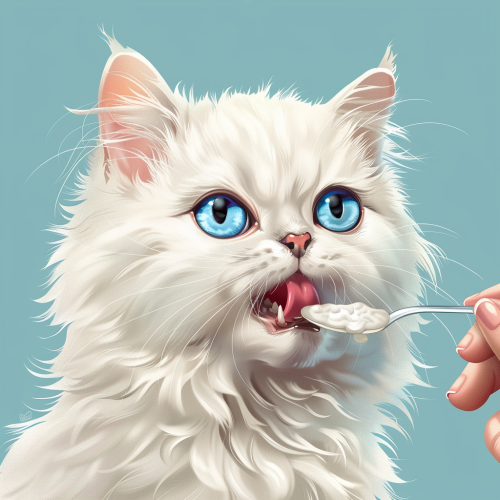 standing cute beauty happy white persian blue eye cat open mouth with hand feeding food with spoon on his mouth, at modern house, realistic, bright, contrast --v 6.0