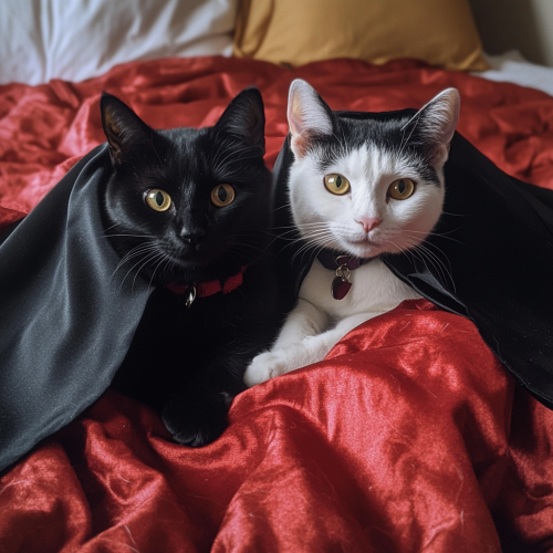 a black cat and a white cat with grey and brown spots in her fur dressed in a vampire halloween costume cape lying on a bed with red sheets in a warm bedroom