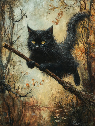 black cat flying on a broomstick in the woods, in the style of vintage painting, with dark tones, set in a rustic countryside, created with oil paint and airbrush art. The background features muted forest colors --ar 3:4