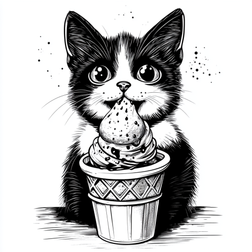 A cartoon style cat eating an ice cream in a waffle, ice cream parlor in the background. funny facial expression. white background . black and white illustration.