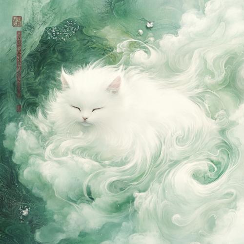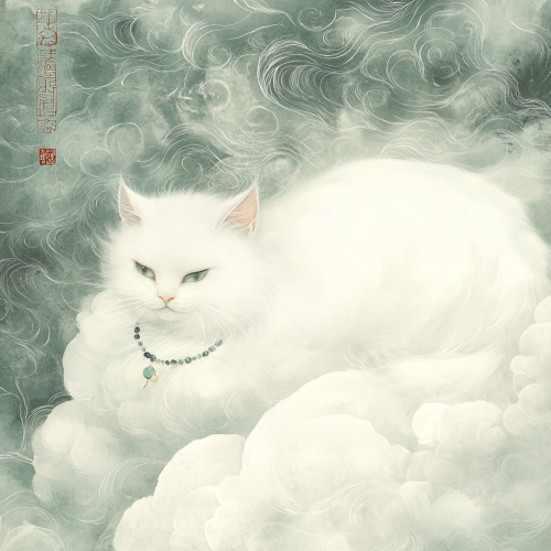 Design a serene and mystical poster in the style of traditional Chinese ink and wash painting, emphasizing flowing, elegant brushstrokes and a harmonious composition. The central figure is a fluffy, elegant white cat with a refined and graceful expression, nestled within soft, swirling clouds. The cat’s fur should blend naturally with the clouds, creating a seamless, airy effect. Adorn the cat with delicate gemstone beads, subtly incorporated into its fur, around its neck, or as a gentle headpiece. The beads should be eye-catching yet harmoniously integrated, adding a touch of elegance and luxury without disrupting the overall balance. The background should feature a soft, light green wash, enhancing the tranquil and otherworldly atmosphere. Include traditional Chinese spiritual motifs, such as lotus flowers or intricate cloud patterns, using fine, fluid lines to maintain the sense of harmony and immortality. The entire image should evoke calm, elegance, and mystical beauty, perfectly aligning with the theme of a gemstone beads jewelry online shop.