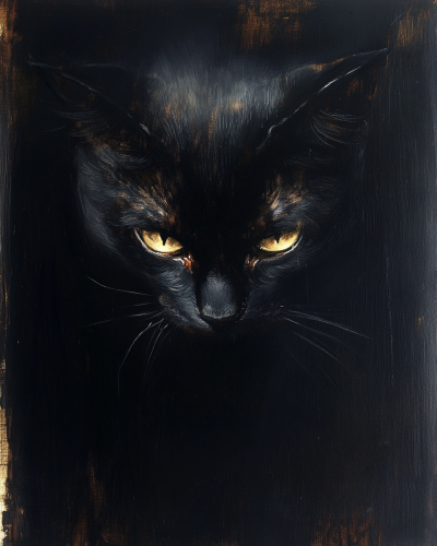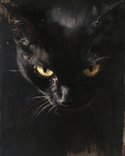 John Singer Sargent painting depicting front view our subject looks down at us, portrait of a black cat towering over us with a strong jaw, very realistic image and dramatic lighting deep blacks --ar 4:5