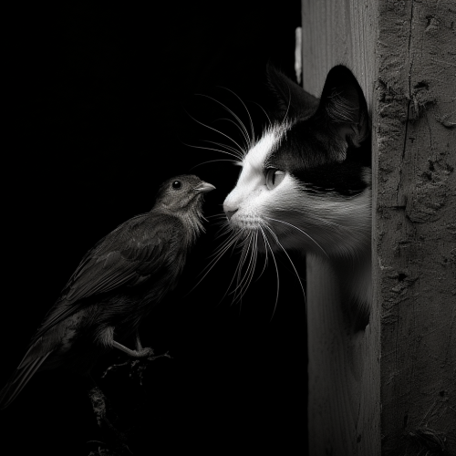 Photograph of a cat eating a bird in black and white primitive in the style of roger ballen