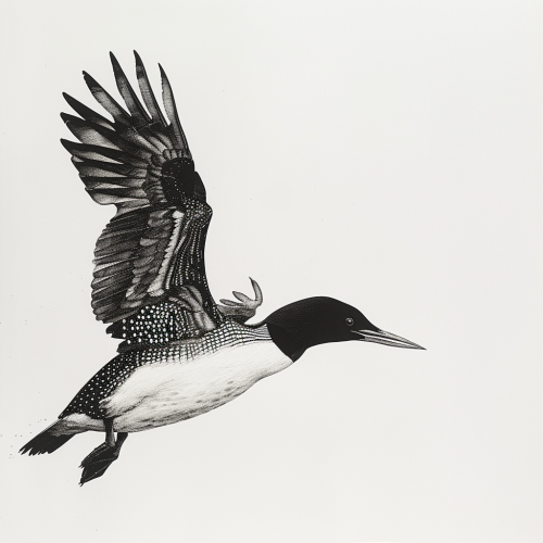 an image of a common Loon bird swooping downward. a black and white drawing on white background. the composition should be vertical in nature.