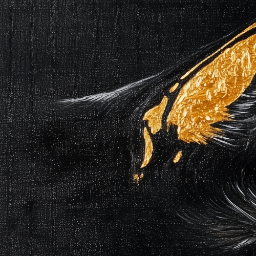 картина трехцветного кота на черном фоне с золотой поталью. Кот смотрит вперед, взгляд пронзительный, уверенный, только морда кота, глубоко подчеркнута его структура, нос, уши, глаза, нос. Особенно взгляд как у черной пантеры --v 6.1