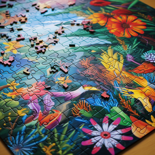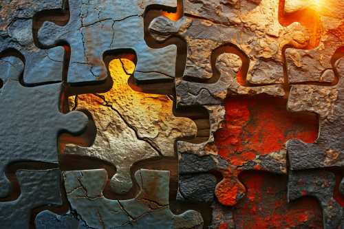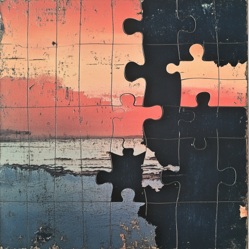 Create an album cover featuring a jigsaw puzzle with one missing piece or a torn photograph with a missing section. Use contrasting colors and sharp lines to represent the sense of incompleteness and absence in 'Without You.