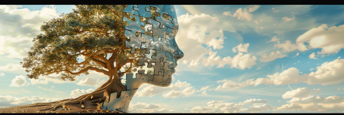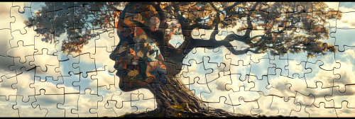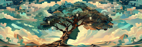 art deco sculptural tree with roots growing along a faceted landscape. The canopy of the tree is large and spreads across the sky. The tree leaves are made of glass jigsaw puzzle pieces The tree is superimposed inside a human head --ar 3:1