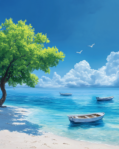 A bright blue ocean with white sand. There is one tree on the beach and two boats in it. There are some clouds in the sky, with light cyan and aquamarine hues. A tranquil sea view, with hyper-realistic water and a few birds flying over the horizon. A dreamy summer scene, photo-realistic. Photorealism, high resolution. --ar 4:5