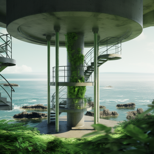 inside of green steel concrete tower over nature concrete platform, on the sea
