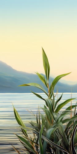 bokeh Hawaiian pandanus, wood, sun, mountains, sea shore, tranquil, zen, --ar 1:2