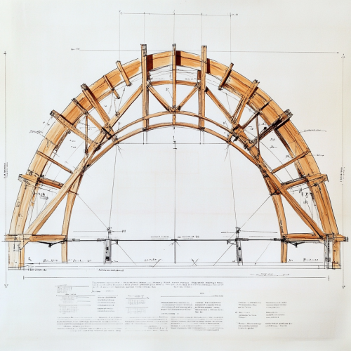 A detailed construction blueprint of a half-ellipse timber truss, 5 meters in length and 1 meter in height at the center. The truss is made from standard French timber sections, with 75x225 mm beams. Include precise measurements, angles, and joinery details such as half-lap joints, reinforced with bolts and metal brackets. The plan should show front, side, and top views, with clear labels and dimensions for each component. Highlight the key points of assembly, including the central wooden keystone fixed with wooden dowels.