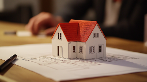 small, three-dimensional model of a white house with a red roof placed on top of an architectural blueprint or drawing. The model is detailed, featuring windows, doors, and other architectural elements like eaves and gutters. To the left of the model, there is a black pen lying on the paper. In the background, part of a human hand is visible, suggesting that someone is working on or presenting this model. --ar 16:9