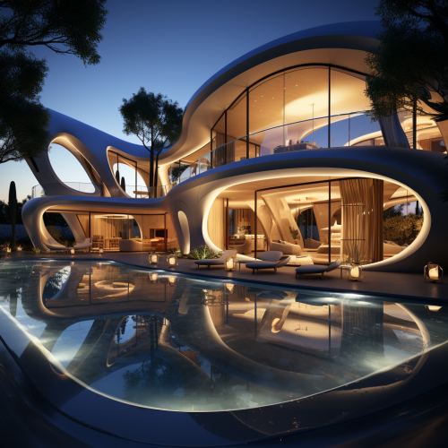 cinematic shot of an arabian heritage house designed in the style of architect Zaha Hadid located in Dubai --s 750