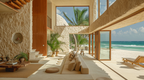 Interior photograph of a Luis Barragan house on a white sand beach in Tulum, Mexico --ar 16:9 --v 6.0