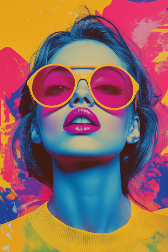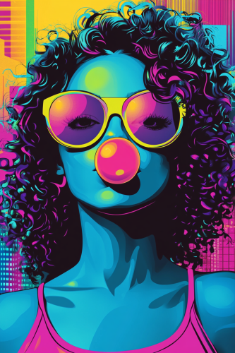 Create a vibrant pop art-style poster featuring a confident young woman with curly hair blowing bubble gum. Use bold colors like electric blue, hot pink, and neon green. The background should have a dynamic, geometric pattern with sharp contrasts. The woman's expression should be playful yet assertive, with oversized sunglasses reflecting a cityscape in vivid colors. Keep the overall style edgy, modern, and energetic. --ar 2:3